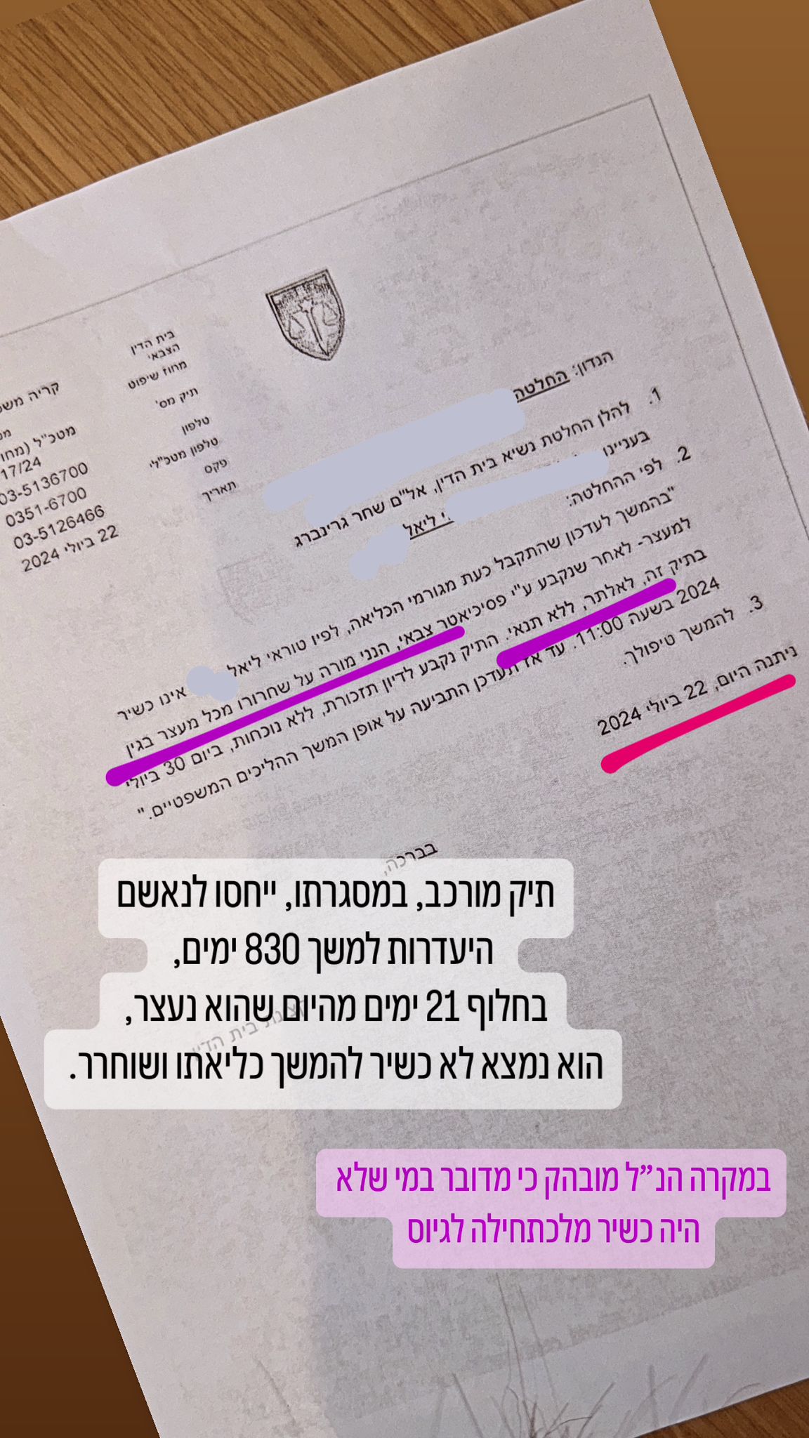 לקוח שנעדר במשך 830 ימים בחלוף 21 ימים מהיום שנעצר הוא נמצא לא כשיר להמשך כליאתו ושוחרר