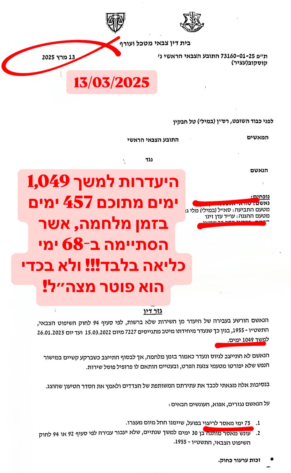 היעדרות במלחמה למשך 1057 ימים שהסתיימה ב-68 ימי כליאה בלבד ופטור!!!