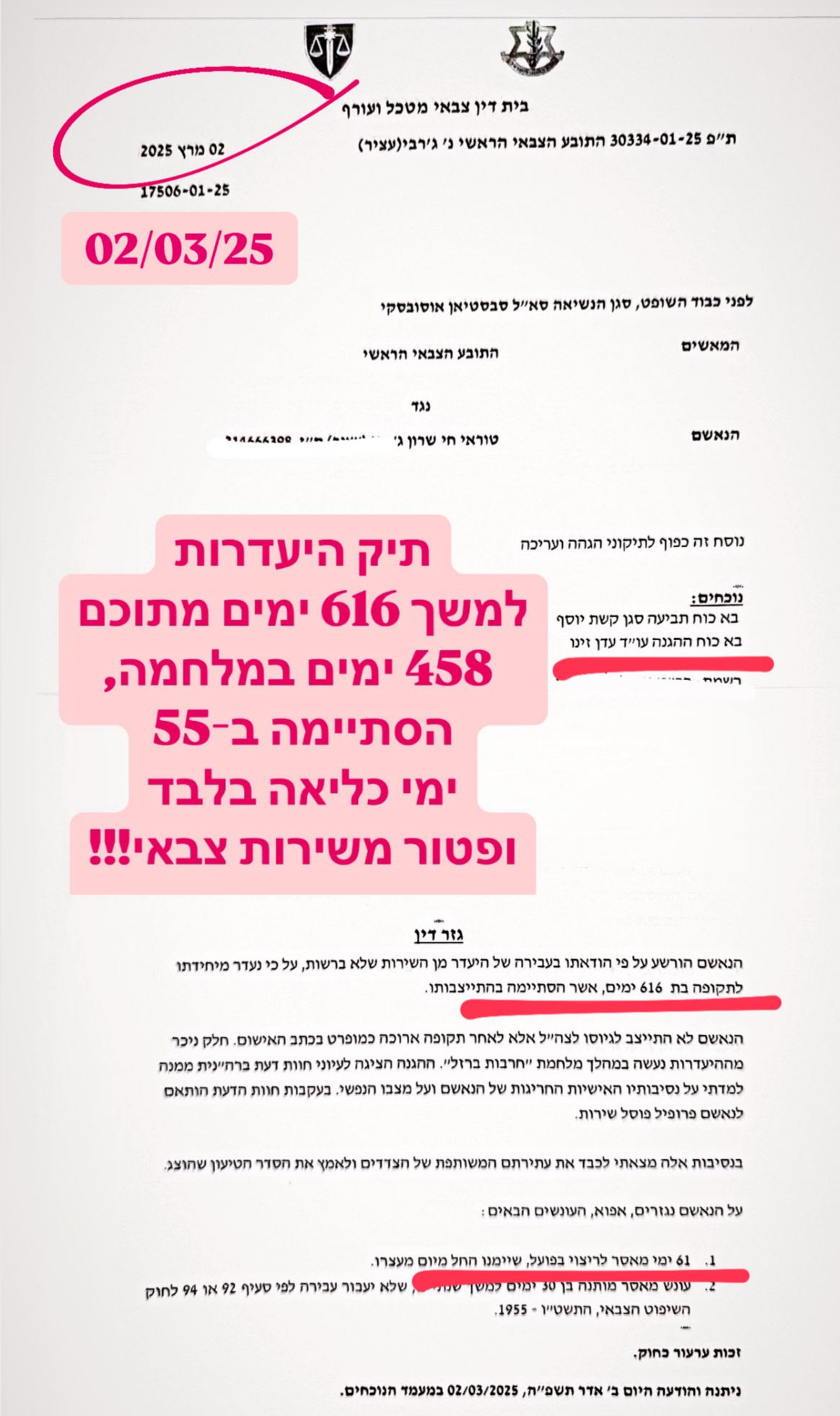 היעדרות למשך 616 ימים, מתוכם 458 במלחמה, הסתיימה ב-50 ימי כליאה בלבד! ופטור מצה״ל״