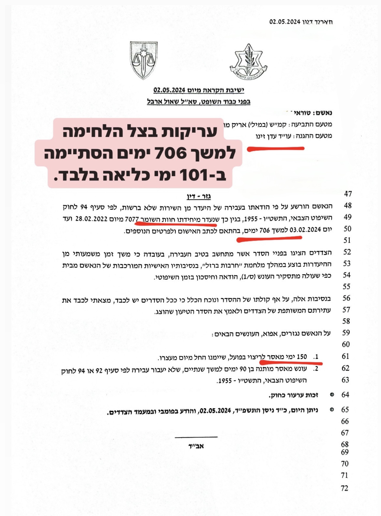 עריקות יחידה, בזמן המלחמה, למשך 706 ימים הסתיימה ב-101 ימי כליאה בלבד!