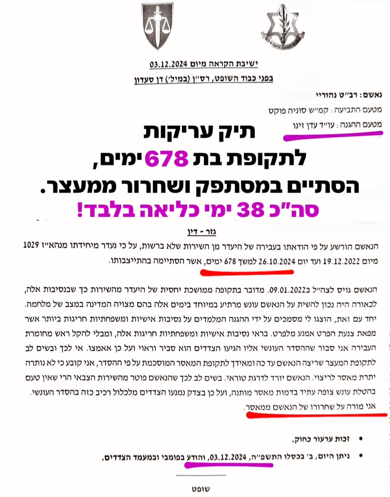 תיק עריקות לתקופה בת 678 ימים, הסתיים ב- 38 ימי כליאה ופטור